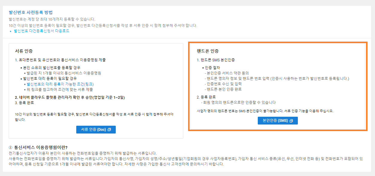 아래의 가이드는 개인 핸드폰 번호를 발신번호로 등록하는 과정을 따라갑니다.