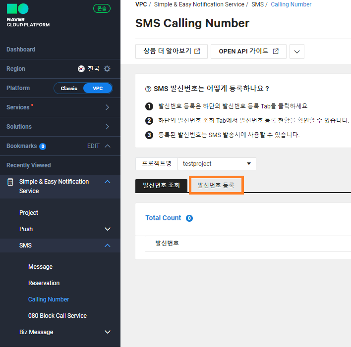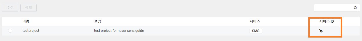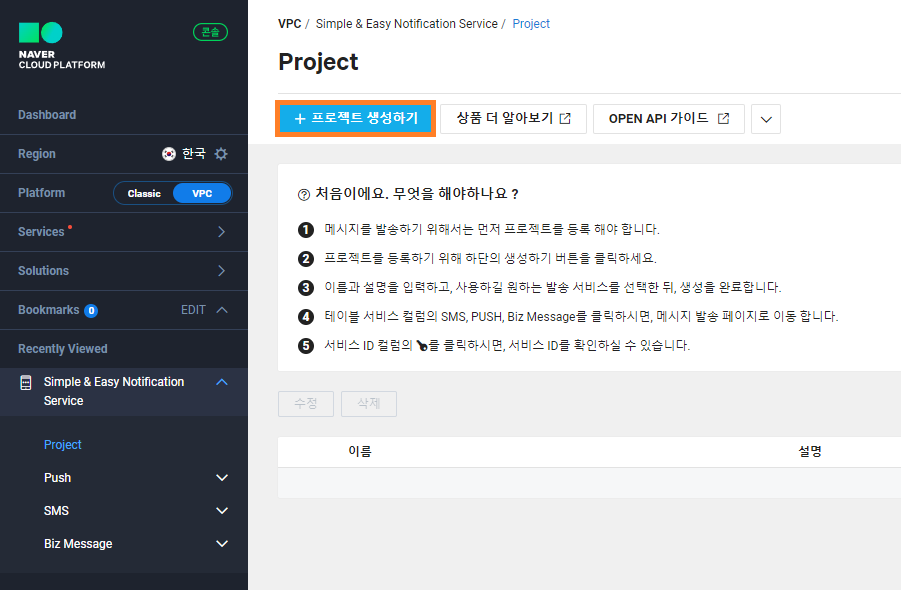 SENS(Simple & Easy Notification Service) 서비스는 Project를 기반으로 동작하므로,