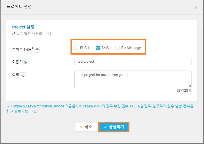 서비스 Type에서 SMS를 선택하시고, 원하시는 이름으로 설정해주시고 생성하기를 눌러주세요.