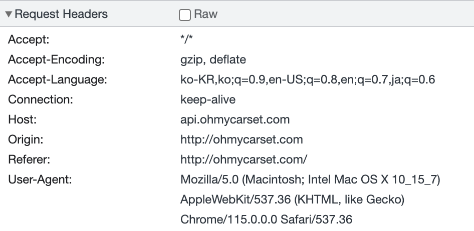따라서 브라우저는 api.ohmycarset.com에 요청할 때 아래처럼 Origin 헤더를 설정하여 보내주게 됩니다.
