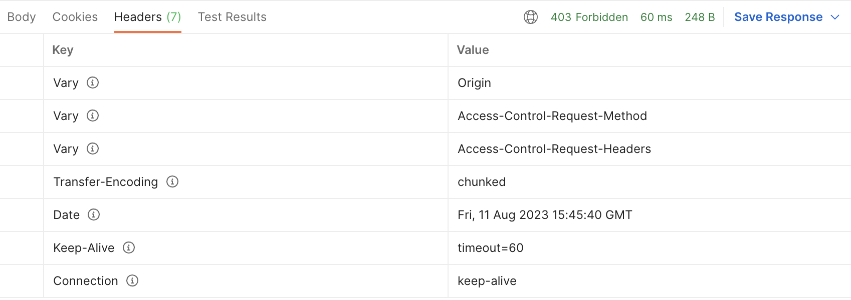 Vary라는 키로 뭔가 여러 헤더값들이 설정되어 있긴 하지만, CORS 처리에 필요로 하는 'Access-Control-Allow-Origin' 헤더가 보이지 않습니다. 대체 왜일까요?