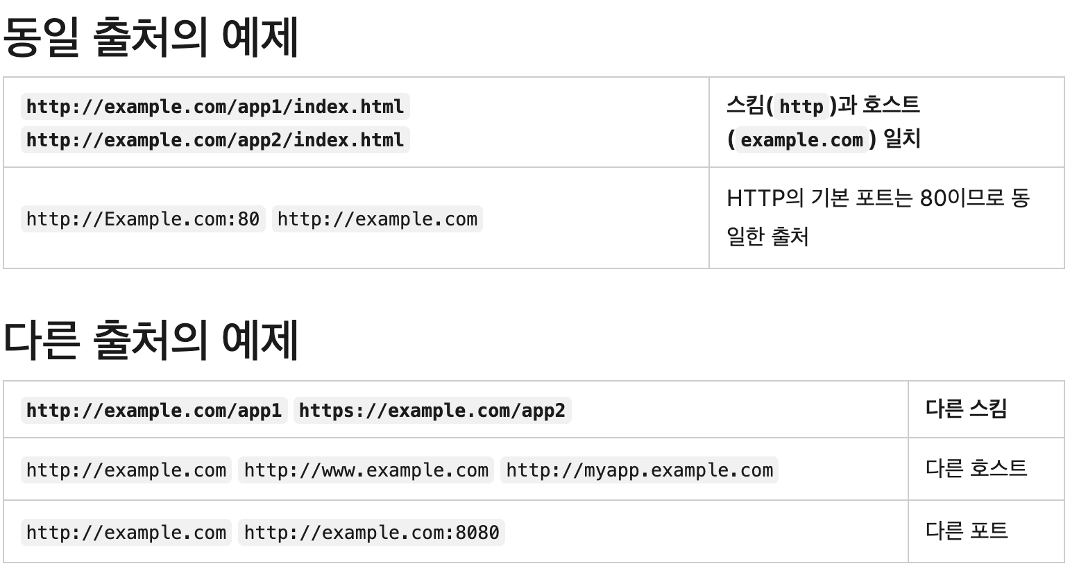 웹 콘텐츠의 출처(origin)는 접근할 때 사용하는 URL의 스킴(프로토콜), 호스트(도메인), 포트로 정의됩니다. 두 객체의 스킴, 호스트, 포트가 모두 일치하는 경우 같은 출처를 가졌다고 말합니다. - MDN Web Docs