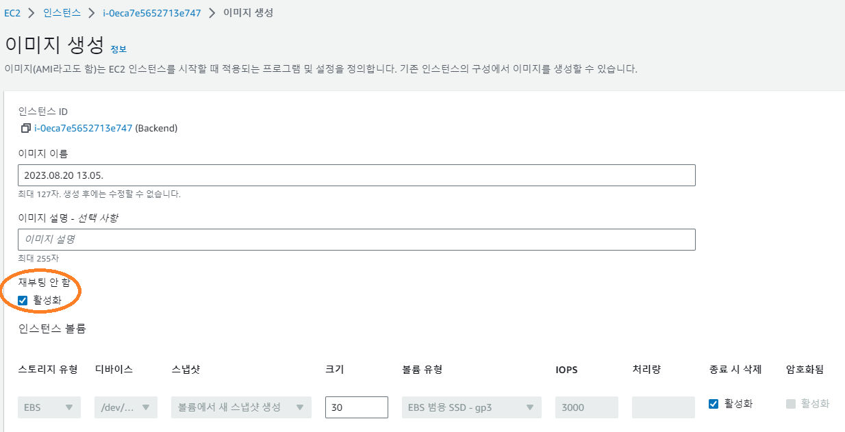 그렇지 않으면 원본 인스턴스가 재부팅됩니다! 설정을 마치셨다면 이미지 생성을 눌러주세요.