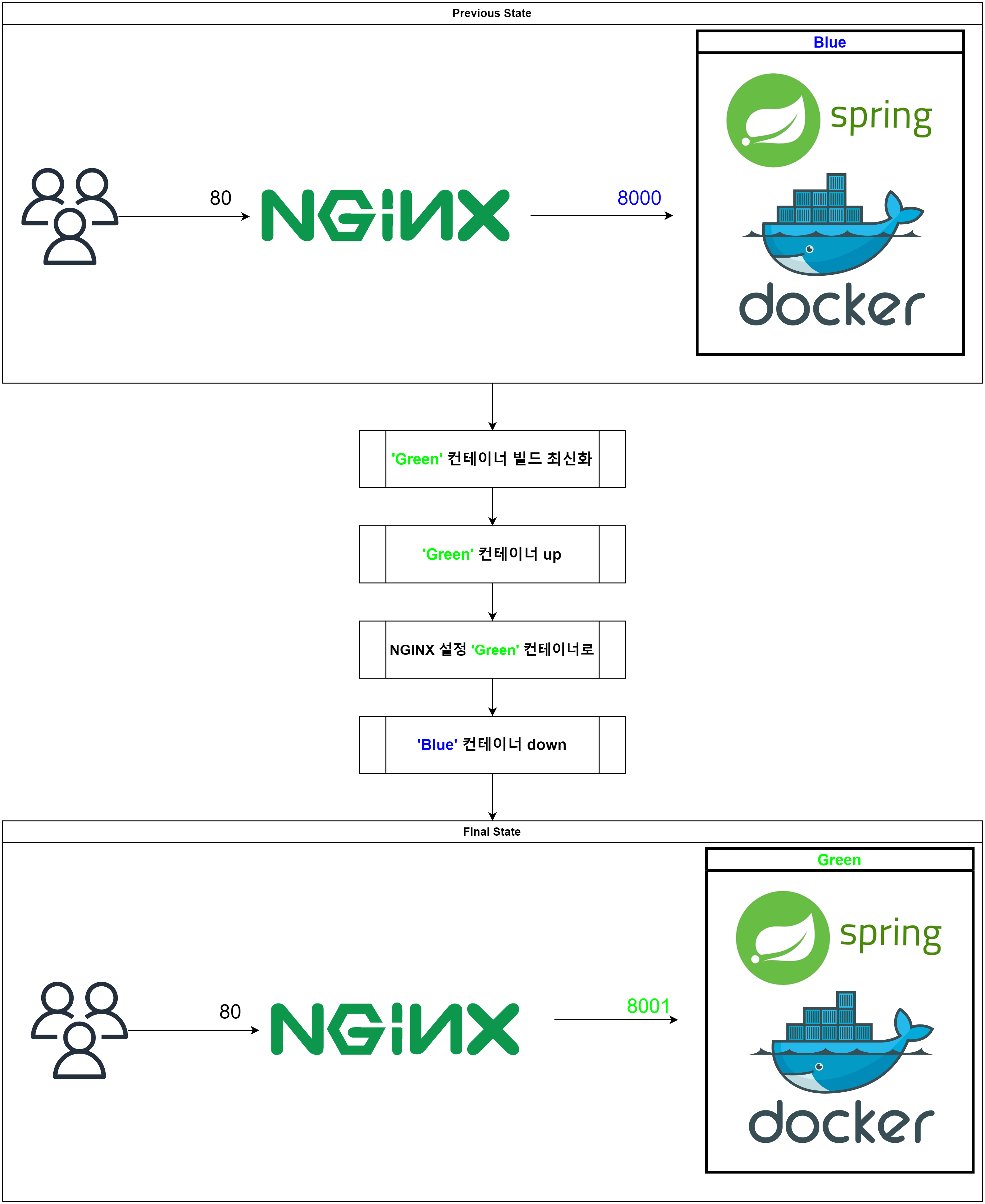 | 1. 기존에 어떤 컨테이너가 동작중이었는지 판별하여, 동작중이지 않던 컨테이너에 새로운 버전의 빌드 파일을 주입합니다. 2. 위 새로 업데이트된 컨테이너를 docker compose로 구동시키고, 정상 처리 상태가 될 때까지 대기합니다. 3. nginx의 설정을 수정하여 모든 트래픽이 업데이트된 컨테이너를 향하도록 합니다. 4. 기존 사용중이던 구버전의 컨테이너를 종료합니다. 추후 새로운 버전이 배포되면 지금 종료된 컨테이너를 이용하게 됩니다. |