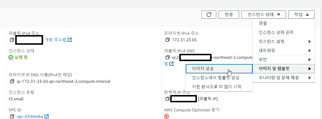 우선, 현재 작동중인 EC2 인스턴스의 상세 설정에 들어가 작업>이미지 및 템플릿>이미지 생성을 눌러 이미지 생성 창으로 이동합니다.