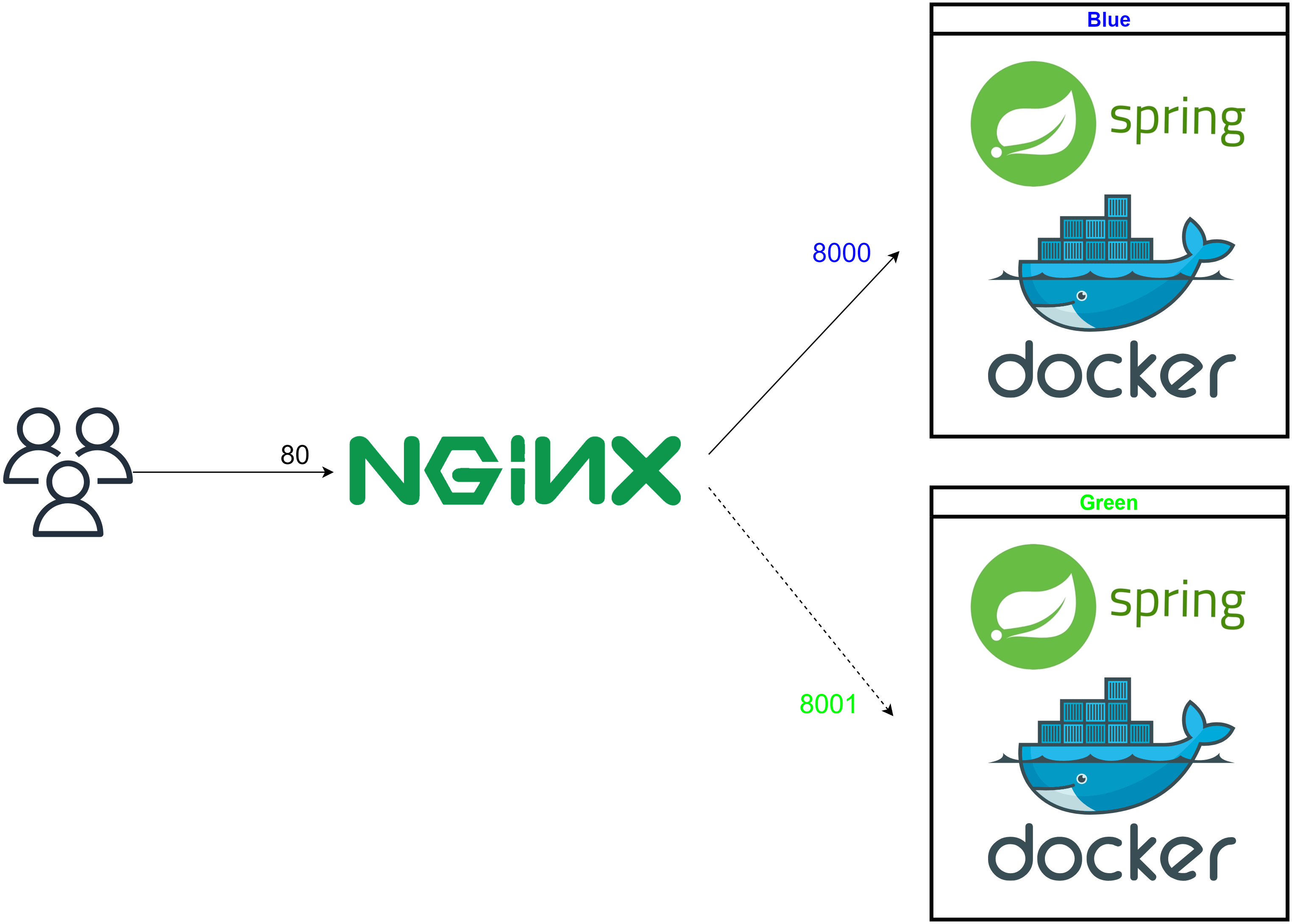 '블루-그린' 전략이란 기본적으로 2개의 포트에 각각 돌아가는 컨테이너를 두고, 배포가 새로 이루어질 때 아래와 같이 동작시키는 것을 말합니다.