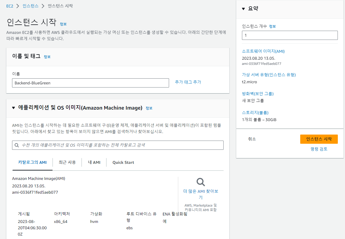 그 후에는 평소 인스턴스를 생성하듯이 진행하시면 되는데, '애플리케이션 및 OS 이미지'에 보시면 저희가 설정한 AMI가 들어가 있는 것을 볼 수 있습니다.