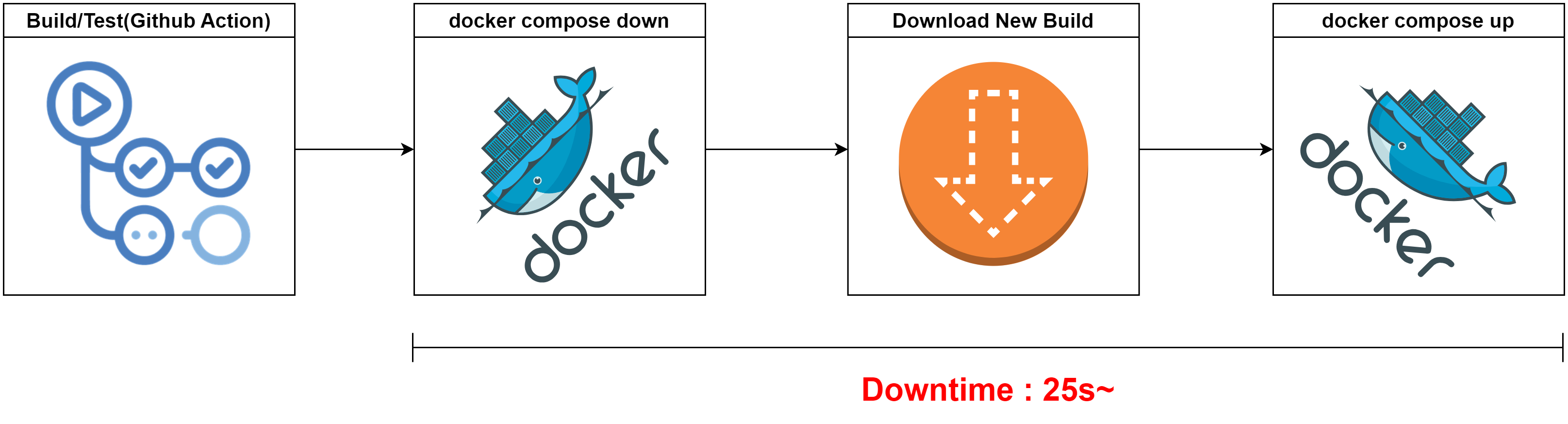 | 1. Github Action으로 빌드/테스트 작업을 진행합니다. 2. 도커 컴포즈로 동작중인 컨테이너를 'docker compose down'으로 내립니다. 3. 새로운 빌드 결과물을 SCP로 전달받습니다. 4. 다시 도커 컴포즈로 'docker compose up'하여 컨테이너를 올립니다. |
