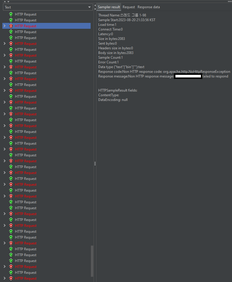 대부분의 시간에 정상 처리가 이루어졌지만, 일부 요청은 오류가 발생한 것을 볼 수 있습니다.