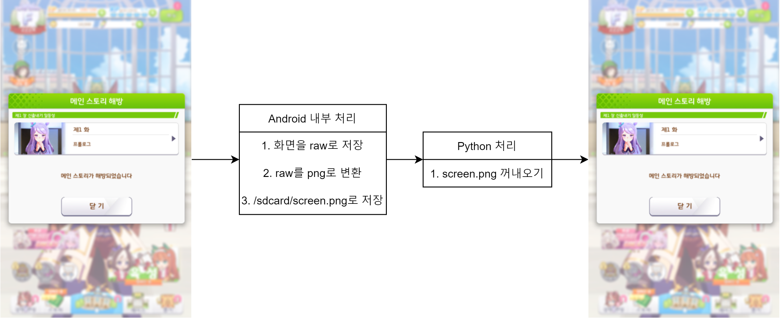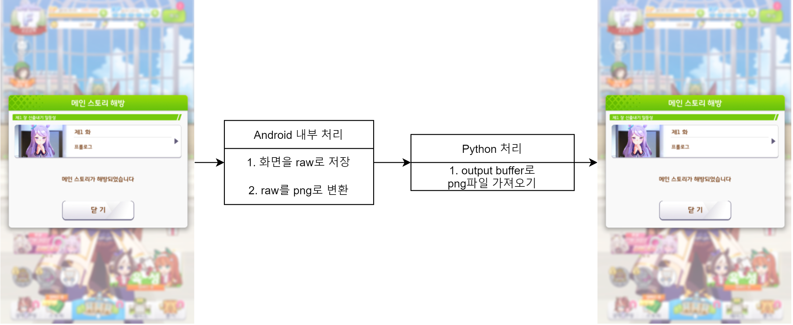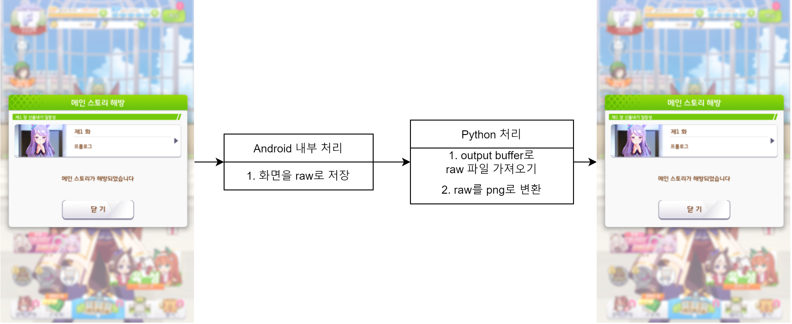 adb를 이용해서 안드로이드에 직접 접근해서, 스크린샷 파일을 png로 저장되게 한 다음, 해당 파일을 꺼내오는 방식이었습니다.